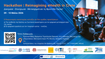 Με την υποστήριξη του Κόμβου Καινοτομίας για την Ψηφιακή Διακυβέρνηση GR digiGOV-innoHUB 9-10 Μαΐου 2026Διεξαγωγή:… Περισσότερα »HACKATHON “Reimagining eHealth in Crete”: Δηλώστε Συμμετοχή!