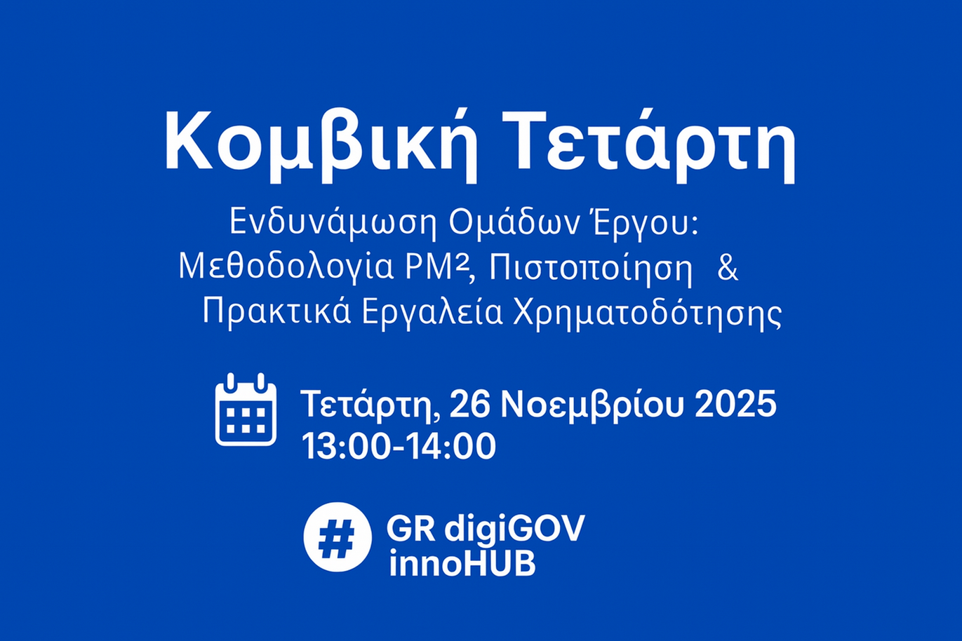 Κομβική Τετάρτη : 26/11/2025-«Ενδυνάμωση Ομάδων Έργου: Μεθοδολογία PM², Πιστοποίηση & Πρακτικά Εργαλεία Χρηματοδότησης»