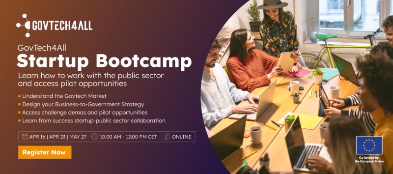 Με βασικό μήνυμα “Understand the GovTech Market. See what success looks like. Find out and pre-apply to real pilot opportunities”, το ευρωπαϊκό έργο GovTech4All διοργανώνει Startup Bootcamp στις 16 & 23 Απριλίου, και στις 27 Μαΐου 2026. Το Bootcamp είναι μια δωρεάν, διαδικτυακή σειρά 3 συνεδριών που έχει σχεδιαστεί για να βοηθήσει νεοφυείς επιχειρήσεις και ΜμΕ από την ΕΕ να αποκτήσουν βαθύτερη κατανόηση της αγοράς GovTech, να διαμορφώσουν τη σωστή στρατηγική B2G (Business to Government), καθώς και να ενημερωθούν για τις διαθέσιμες ευκαιρίες υλοποίησης πιλοτικών έργων.